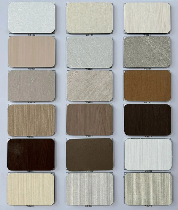 2、装饰膜层:水性PVC、金属拉丝、PP耐刮、哑光岩板、PET镜面、PET-G高光等膜材自由组合,呈现木纹、布纹、石材纹、金属拉丝及玻璃质感等丰富花色。