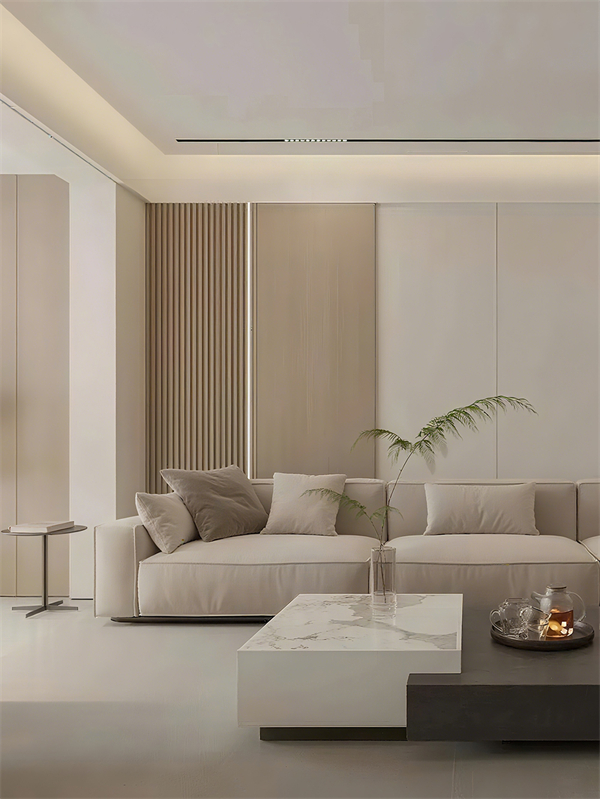 木饰面的沙发背景墙因为这几年一直很火,它为什么这么受欢迎呢?它自带一种自然质感和温暖的色调,往客厅一装,整个空间立马就有了独特的韵味。而且它跟各种风格的家具都能搭配得很好。要是你家放的是皮质沙发、简约茶几,再配上木饰面沙发背景墙,高级大气、时尚轻奢的氛围一下子就出来了。木饰面的颜色选择也多,你要是喜欢沉稳、有格调的感觉,就选深色系的木饰面;要是想让家里温馨点、惬意点,浅色系的木饰面就是不错的选择。